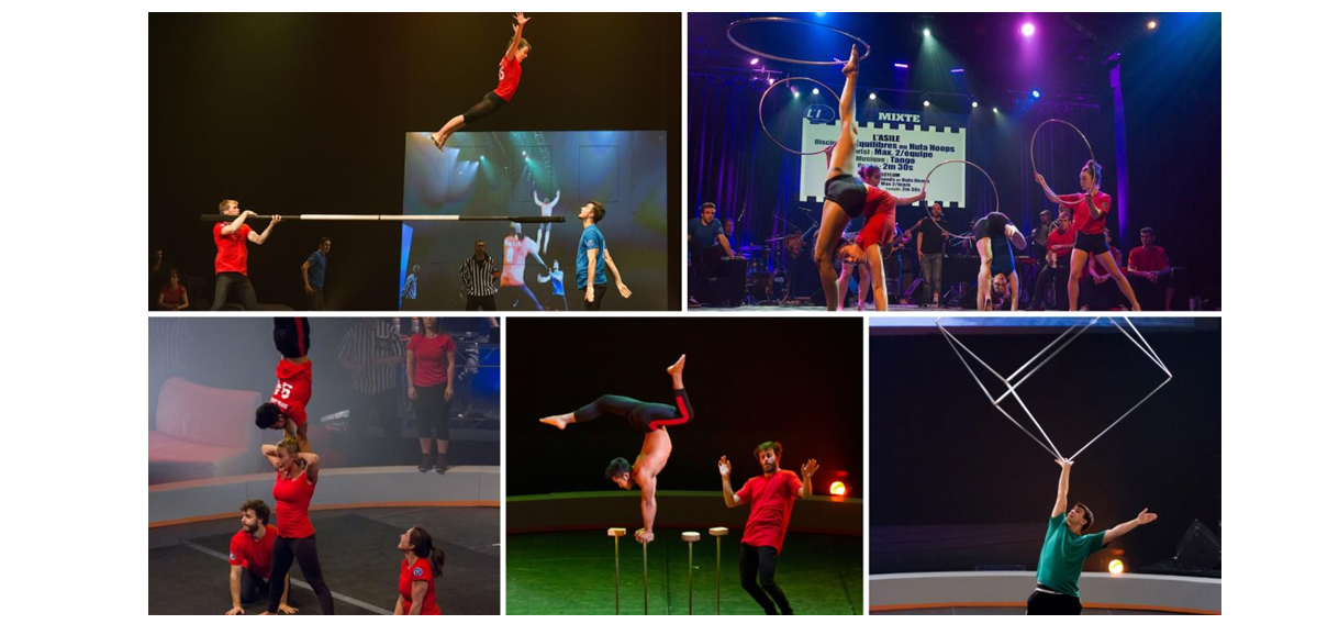 Des artistes de cirque en pleine performance d'improvisation sur la piste de la TOHU.